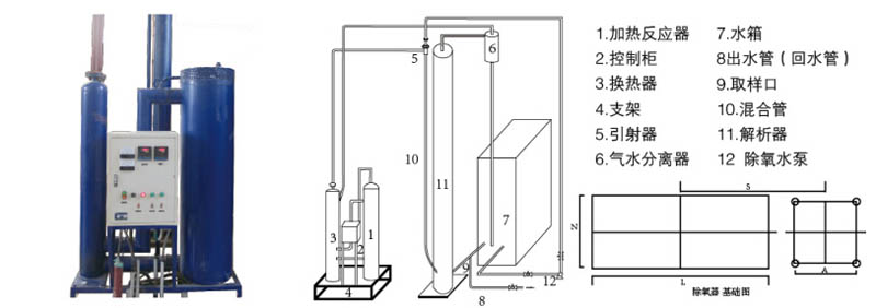 由于設(shè)備結(jié)構(gòu)簡單,所以在設(shè)計和安裝方面沒有特別嚴格的要求,下列幾點在必要時可據(jù)具體情況進行不同程度的改動1、設(shè)備只需單地基,建議解吸器底部預(yù)埋鋼板,安裝時現(xiàn)場焊接;反應(yīng)器底部只需水平; 2、設(shè)備距墻不少于30cm,設(shè)備的相對位置可根據(jù)具體情況有一些變動;3、在設(shè)備附近的墻上安置配電柜,功率因設(shè)備型號而異; 4、按流程根據(jù)現(xiàn)場條件將設(shè)備就位, 應(yīng)注意保持解吸器頂部高于水箱最高水位2米以上;5、建議除氧泵揚程45~50米;除氧泵流量應(yīng)為設(shè)備出力的1.25~1.5倍(型號參見表四);6、按流程將設(shè)備連接起來,接口除特定指明外以焊接為佳;設(shè)備及各管路應(yīng)無泄漏; 7、在保證流程合理的前提下,設(shè)備可靈活布置,建議靠墻或邊角布置;8、設(shè)備布置困難時,可將引射器、解吸器氣水分離器與換熱器、加熱反應(yīng)器、電控柜分開布置(如分置于室內(nèi)外、分置于不同樓層等);9、若用戶需要有專用的密閉除氧水箱,可根據(jù)附圖進行連接.