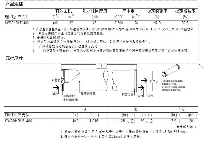 FilmTec™ SW30HRLE-400 元件的高脫鹽率和低能耗的組合特點能夠降低中等和高 等鹽度進水的系統(tǒng)總投資。FilmTec™ SW30HRLE-400 元件有以下優(yōu)點 :