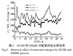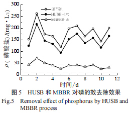 從圖4 和圖5 中可以看出,HUSB 對(duì)氨氮和磷具有一定的去除效果,平均去除率分別為18.9%和18.6%。而MBBR 對(duì)氨氮和磷去除效果,則平均分別為77.5%和72.1%。具體參見(jiàn)http://www.dowater.com更多相關(guān)技術(shù)文檔。