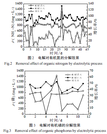 電解過(guò)程對(duì)廢水可生化性的提高作用,還表現(xiàn)在廢水中氨氮和無(wú)機(jī)磷濃度的增加,如圖2 和圖3所示,電解過(guò)程對(duì)有機(jī)氮的分解效果可使出水氨氮濃度水平平均增長(zhǎng)率達(dá)34.7%。對(duì)有機(jī)磷的分解效果則可使出水磷酸鹽磷濃度水平平均增長(zhǎng)率達(dá)26.7%,可見(jiàn)電解過(guò)程起到了部分分解有機(jī)物,降低了有機(jī)物濃度水平,同時(shí)電解后的混合液,氨氮和無(wú)機(jī)磷的濃度水平都有了一定幅度的提高,將使電解出水中C:N:P 的比例更適于生物降解,也即增加了廢水的可生化性。