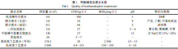 某公司所排放的甲胺磷廢水主要由甲胺磷等各種農(nóng)藥制劑生產(chǎn)過(guò)程中產(chǎn)生的廢水,如甲基氯化物、二甲胺、吡蟲(chóng)啉等成分混合而成,pH 約為9~10,COD 范圍在20~30 g/L,鹽度大于15%, B/C比小于0.1,可生化性差,其中,高濃度甲胺磷有機(jī)廢水總量約178.3 m3/d,低濃度甲胺磷生產(chǎn)廢水總量約2 000 m3/d。