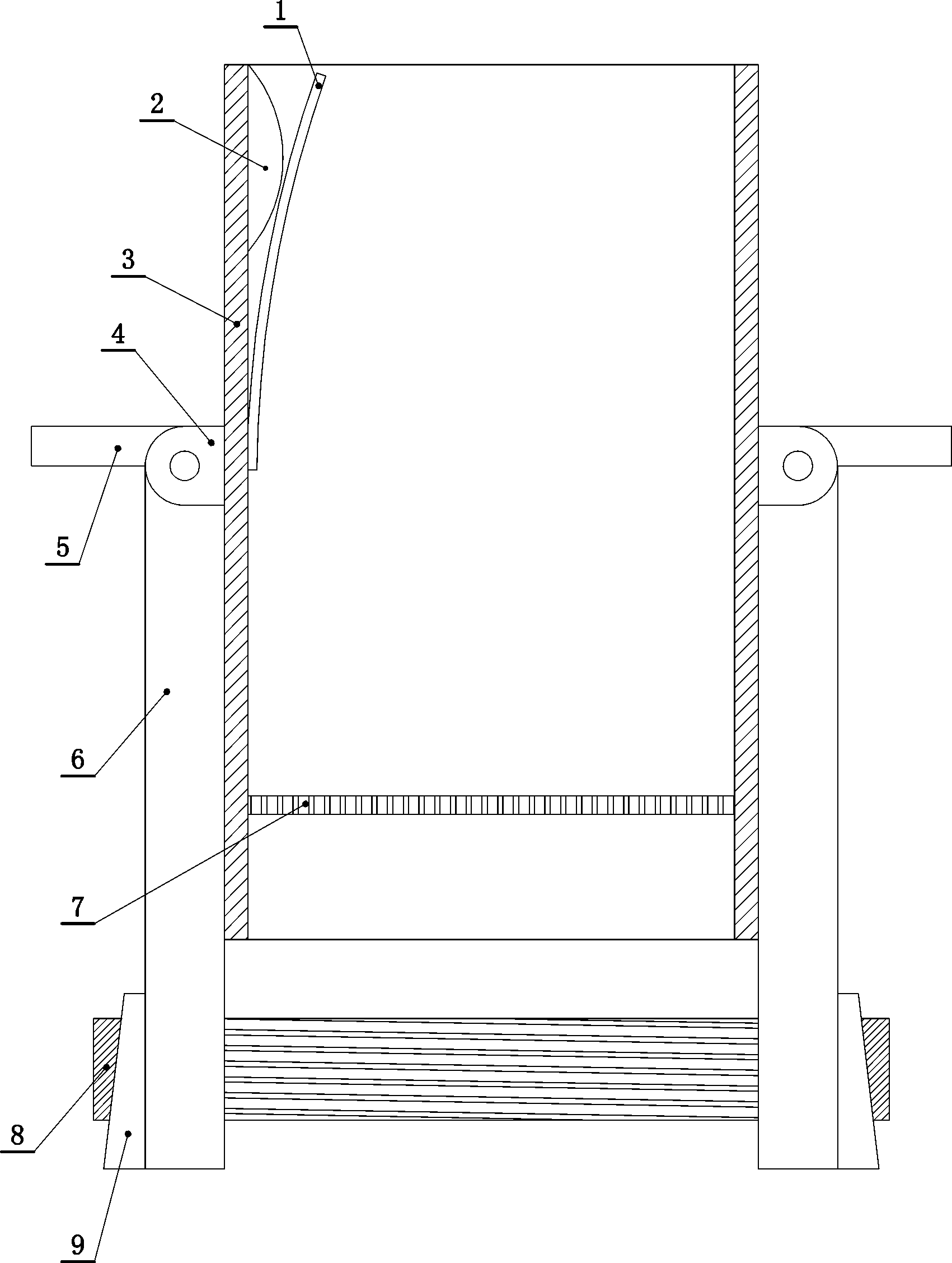 一種污水雜質(zhì)過濾器,外殼外面鉸接有多個支撐架,支撐架為“L”型,支撐架包括垂直相交的擋桿和支撐桿,擋桿位于支撐桿上端,擋桿與支撐桿的相交處與外殼相鉸接,支撐架向上翻折時、擋桿緊貼在外殼外面,支撐架向下翻折時、支撐桿緊貼在外殼外面,且外殼的下端懸空架起,支撐桿的下端外側(cè)固定連接有突塊,突塊的外側(cè)面帶有外螺紋,突塊上側(cè)的支撐桿外套穿有與突塊相對應的螺母,螺母帶有與突塊的外螺紋相對應的內(nèi)螺紋,支撐架向下翻折后、螺母與突塊螺紋相連,支撐架向上翻折后、螺母架設(shè)在支撐桿上。突塊的外側(cè)面傾斜設(shè)置,突塊的外側(cè)面上端向內(nèi)傾斜、下端向外傾斜。外殼的內(nèi)側(cè)壁上部固定連接有彈性夾板,彈性夾板與外殼圍成的空間開口向上。