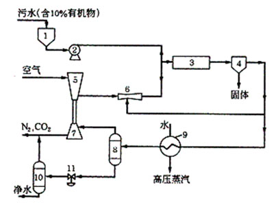 1-污水槽;2-污水泵;3-氧化反應(yīng)器;4-固體分離器;5-空氣壓縮機;6-循環(huán)用噴射泵;7-膨脹機透平;8-高壓氣液分離器;9-蒸汽發(fā)生器;10-低壓氣液分離器; 減壓器