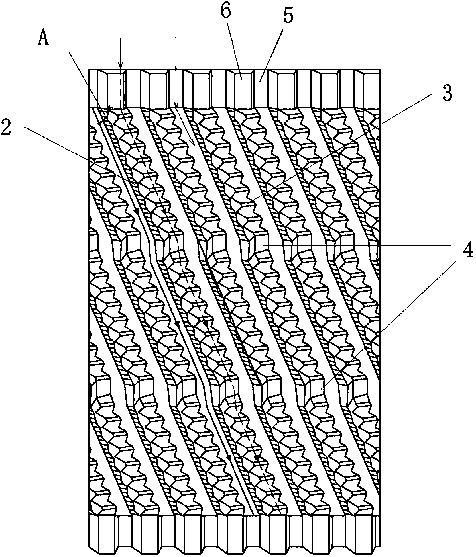 本實(shí)用新型的污水處理填料的結(jié)構(gòu)設(shè)計(jì)獨(dú)特,單片波紋薄板的波紋紋路在縱向上呈一列列傾斜的階梯狀排布,由若干片波紋薄板兩兩反向靠疊粘結(jié)組合而成的整個(gè)波紋填料模塊的整體外形為長(zhǎng)方體,模塊內(nèi)部為蜂窩狀(內(nèi)部有許多交錯(cuò)的蜂窩狀凹渠,每個(gè)蜂窩狀凹渠內(nèi)部又有許多傾斜的臺(tái)階),有利于大幅提高比表面積,掛膜率高;形成的蜂窩狀凹渠使得水流能夠重新分布,改變其流動(dòng)方向,從而使水流在橫截面上分布更為均勻;同時(shí),水流在填料內(nèi)部形成交叉流動(dòng)混合,為廢水和生物體的接觸創(chuàng)造了良好的水力條件。