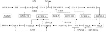 原廢水處理工藝存在以下問(wèn)題:(1)無(wú)pH調(diào)節(jié)系統(tǒng),無(wú)法對(duì)廢水進(jìn)行加酸調(diào)節(jié),尤其在廢水間歇排放時(shí),有時(shí)pH可達(dá)到10~12,堿性很強(qiáng),會(huì)對(duì)后續(xù)生物處理系統(tǒng)中微生物的呼吸作用及代謝功能產(chǎn)生障礙,嚴(yán)重影響生物處理系統(tǒng)的處理效果。(2)初沉池由于設(shè)計(jì)缺陷,沉淀時(shí)間較長(zhǎng),且不能及時(shí)排泥,沉淀污泥在池內(nèi)停留時(shí)間較長(zhǎng)。廢水中油脂、碎肉和皮屑等含有大量蛋白質(zhì),在長(zhǎng)時(shí)間缺氧條件下發(fā)生氨化反應(yīng),蛋白質(zhì)水解為氨氮進(jìn)入廢水中,給后續(xù)的生化脫氮帶來(lái)負(fù)擔(dān),造成出水氨氮超標(biāo)。(3)二級(jí)生化處理采用氧化溝工藝,缺少缺氧段,同一溝中好氧區(qū)與缺氧區(qū)各自的體積和溶解氧濃度很難準(zhǔn)確地控制,因此無(wú)法保證對(duì)氨氮和總氮的去除效果。(4)氧化溝溝道較長(zhǎng),倒傘曝氣氧利用率低,且缺少推流器,機(jī)械攪拌強(qiáng)度不夠,造成溝內(nèi)污泥沉積,泥水混合不均,處理效果差。(5)現(xiàn)有工藝缺少部分深度處理設(shè)施,無(wú)法保證出水穩(wěn)定達(dá)標(biāo)排放。