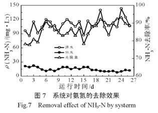 經(jīng)過近6 個月的調(diào)試時間,廢水處理設(shè)施的處理能力及出水各項水質(zhì)指標(biāo)均到達了設(shè)計要求,根據(jù)2012 年9 月份運行數(shù)據(jù),在進水COD 為5118 ~7 322 mg/L、NH3-N 質(zhì)量濃度為85 ~143mg/L,系統(tǒng)處理出水COD 為92~118 mg/L、NH3-N質(zhì)量濃度8~22 mg/L,COD 及NH3-N 的去除率分別為97.9%~98.7%、77.6%~93%,達到GB 21904-2008 標(biāo)準(zhǔn),具體處理效果如圖6、圖7 所示。