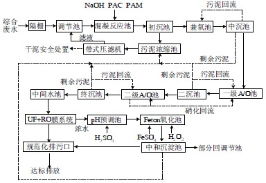 綜合廢水經(jīng)格柵井后進入調(diào)節(jié)池,經(jīng)調(diào)節(jié)池均質(zhì)均量后泵入混凝反應(yīng)池,在反應(yīng)池中投加適量NaOH、PAC 和PAM 充分混凝反應(yīng)后泥水流入初沉池進行分離,初沉池出水自流入兼氧- 兩級A/O 生化處理系統(tǒng),經(jīng)徹底的生物脫碳和硝化反硝化脫氮作用后生化處理出水匯入中間水池,中間水池廢水再經(jīng)泵提升入“UF+RO”膜分離系統(tǒng)進行深度處理,膜分離濃水經(jīng)Fenton 氧化池氧化分解較大部分殘留的有機污染物后再經(jīng)加堿中和沉淀處理,沉淀出水與膜分離淡水混合達標(biāo)排放。具體工藝流程如圖1 所示。