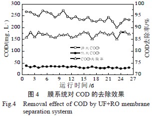 生化系統(tǒng)處理出水水質(zhì)穩(wěn)定后接著進行“UF+RO”膜系統(tǒng)調(diào)試。先進行超濾前處理系統(tǒng)的調(diào)試,當(dāng)出水穩(wěn)定達到超濾設(shè)計進水水質(zhì)要求后按設(shè)計水量的60%左右啟動調(diào)試運行24 h 后再增至設(shè)計產(chǎn)水量運行;當(dāng)超濾系統(tǒng)出水水質(zhì)穩(wěn)定達到反滲透系統(tǒng)進水要求后啟動反滲透系統(tǒng)的調(diào)試運行。通過調(diào)試確定合理的操作壓力、清洗及藥洗的時間間隔,比較終保證膜處理系統(tǒng)符合設(shè)計要求。從調(diào)試運行結(jié)果來看,“UF+RO”膜系統(tǒng)對COD 具有高效的截留作用,其對COD 的去除效果如圖4 所示。