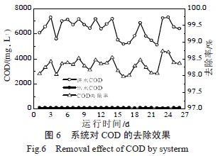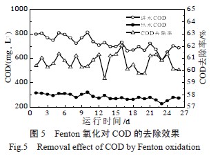 對反滲透濃水先進行Fenton 氧化試驗小試,試驗方法采用以H2O2(30%)投加量、FeSO4 投加量、pH、反應(yīng)時間為變量的4 因素3 水平正交試驗和比較佳水平組合試驗,結(jié)果表明,各因素對COD 去除的影響順序:H2O2投加量>PH>反應(yīng)時間>FeSO4投加量;比較佳工藝控制條件:pH=3,H2O2 投加量2mL/L,F(xiàn)eSO4 投加量300 mg/L,反應(yīng)時間3 h。按照試驗確定的pH 及投藥量進行Fenton 氧化及中和沉淀段的調(diào)試運行,實際Fenton 反應(yīng)水力停留時間6 h左右,結(jié)果表明對COD 的去除率可達59%~62%,具體對COD 的去除效果見圖5。