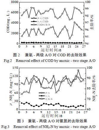 工藝調(diào)試于2012 年3 月份開始,先對兼氧和一級A/O 系統(tǒng)進行接種污泥啟動培菌馴化,初始進水COD 負(fù)荷控制在0.6 kg/(m3·d),并投加面粉、廢甲醇等營養(yǎng)物質(zhì),培養(yǎng)7~10 d 后逐步提高進水負(fù)荷,至進水負(fù)荷達到設(shè)計負(fù)荷的50%時啟動二級A/O 系統(tǒng)調(diào)試,二級A/O 系統(tǒng)接種污泥來自一級A/O 系統(tǒng)活性污泥。歷經(jīng)4 個多月時間,通過控制穩(wěn)定的進水、調(diào)整系統(tǒng)的曝氣量、硝化液回流比、污泥齡等手段使系統(tǒng)處理能力穩(wěn)步提升直至到達設(shè)計處理能力并維持穩(wěn)定的運行狀態(tài)。從滿負(fù)荷穩(wěn)定運行以來的日常水質(zhì)檢測情況來看,在進水平均COD 為5 995mg/L、平均NH3-N 質(zhì)量濃度為107 mg/L,生化處理系統(tǒng)出水平均COD 為243 mg/L,平均COD 去除率為95.9%;出水平均NH3-N 質(zhì)量濃度為16.5 mg/L,平均NH3-N 去除率為84.3%。兼氧- 兩級A/O 系統(tǒng)對COD 和NH3-N 的去除效果見圖2 和圖3。