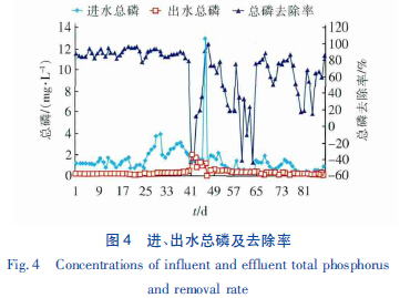 由圖4 可知,進(jìn)水總磷較低,基本在5 mg/L 以下,經(jīng)過水解酸化池-氧化溝處理后,出水總磷下降到0.5 mg/L 以下,能夠達(dá)標(biāo)排放。但運(yùn)行中同時(shí)發(fā)現(xiàn),第42 ~ 46 天出水總磷基本在1 mg/L 以上,超過了排放標(biāo)準(zhǔn),所以在深度處理池中需要投加適量藥劑,進(jìn)行化學(xué)除磷。