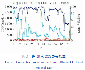 該工程經(jīng)過4 個(gè)月的調(diào)試后進(jìn)入穩(wěn)定運(yùn)行階段。穩(wěn)定運(yùn)行期間對(duì)有機(jī)物的去除情況如圖2 所示。
