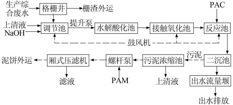 生產(chǎn)廢水中含有的較大藥渣、漂浮物顆粒經(jīng)過前置的格柵攔截后得到有效去除,廢水經(jīng)格柵井后自流入調(diào)節(jié)池進行初步的勻質(zhì)、勻量,同時在調(diào)節(jié)池內(nèi)由計量泵添加一定濃度的堿液,將廢水的pH由初始的4.0~6.0調(diào)整為7.0~9.0;在調(diào)節(jié)pH的同時需利用羅茨鼓風機往池內(nèi)曝氣,主要是因為在調(diào)節(jié)池內(nèi)對廢水進行預曝氣及攪拌可以盡可能地避免大量SS在調(diào)節(jié)池內(nèi)堆積和發(fā)酵,同時還能夠?qū)U水中的低分子有機污染物吹脫氧化。隨后由潛污泵提升至水解酸化池。在水解酸化池中得到馴化、培養(yǎng)的大量厭氧微生物,則直接將廢水中所含的大部分高分子有機污染物破碎降解為小分子有機污染物,進而提高廢水的可生化性,有效地緩解后續(xù)好氧生化處理工序的處理壓力。廢水經(jīng)水解酸化處理后自流進入接觸氧化池,接觸氧化池中的好氧微生物種群及硝化菌菌群在池內(nèi)羅茨鼓風機曝氣充氧的情況下,大量的有機污染物被好氧微生物種群氧化降解為CO2和H2O,廢水中的氨氮則被氧化為硝酸鹽和亞硝酸鹽得以去除。經(jīng)接觸氧化池處理后的出水還需通過外加聚合氯化鋁(PAC)進行比較終的混凝沉淀反應,作用是使廢水中不易沉淀的細小顆粒絮體凝聚形成大顆粒絮體,混合液隨后進入二沉池內(nèi)進行固液分離,保證比較終出水水質(zhì)穩(wěn)定達到排放標準要求。固液分離后的上清液溢流進入出水流量堰可達標排放,剩余污泥則排入污泥濃縮池進行污泥濃縮處理。