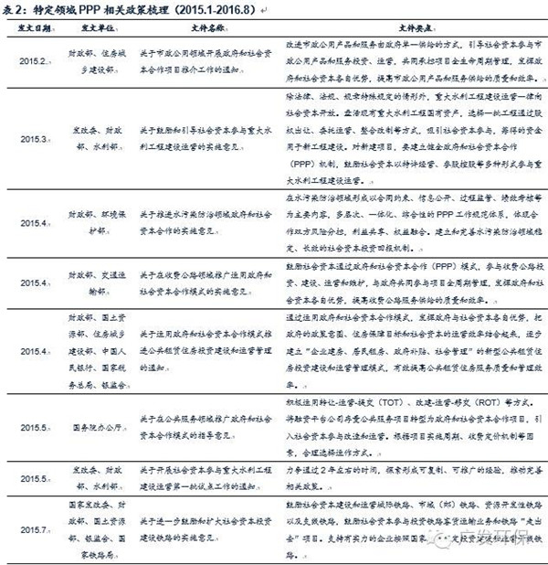 加大在特定領(lǐng)域開展PPP的政策扶持力度。2015年2月,財政部聯(lián)合住建部就市政公用領(lǐng)域開展PPP下發(fā)文件,引導(dǎo)社會資本參與市政公用產(chǎn)品和服務(wù)供給。3月,發(fā)改委、財政部、水利部聯(lián)合推進重大水利工程建設(shè)運營向社會資本開放。4月,財政部、環(huán)保部就水污染防治領(lǐng)域PPP工作規(guī)范體系的建立提出實施意見;財政部、交通運輸部推廣在收費公路領(lǐng)域的PPP模式開展。除此之外,財政部相繼又聯(lián)合國土資源部等部委,分別就公共租賃住房、鐵路建設(shè)、城市停車設(shè)施建設(shè)等領(lǐng)域推廣運用PPP模式下發(fā)指導(dǎo)性文件,引導(dǎo)PPP模式在特定領(lǐng)域的推廣,全方位推動PPP發(fā)展。