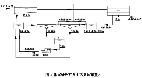 方式(2):沉淀池排泥水濃縮處理,濾池反沖洗廢水經(jīng)廢水調(diào)節(jié)池預(yù)沉,上清液回用或排放,底部污泥水濃縮處理。適用于濾池反沖洗廢水不能滿足回用要求,但預(yù)沉后上清液可以滿足回用要求的情況。