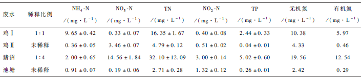 養(yǎng)雞場(chǎng)廢水和養(yǎng)豬場(chǎng)沼液均取自合肥溫氏畜牧有限公司下屬養(yǎng)殖場(chǎng)。其中雞Ⅰ廢水(以下簡稱“雞Ⅰ”)為雞舍污水厭氧發(fā)酵處理后,進(jìn)入植物凈化池的廢水;雞Ⅱ廢水(以下簡稱“雞Ⅱ”)為經(jīng)植物池凈化后進(jìn)入第二植物凈化池的廢水;豬沼廢水(以下簡稱“豬沼”)為豬場(chǎng)通過清糞-沉淀池-酸化池等處理工藝流程排出的沼液經(jīng)沉淀后的上清液;池塘廢水(以下簡稱“池塘”)為本單位觀賞魚養(yǎng)殖池塘水。