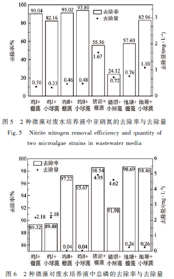 由圖5 可知,柵藻+ 雞Ⅰ組和柵藻+ 雞Ⅱ組以及小球藻+ 雞Ⅱ組中亞硝氮的去除率均在90% 以上。此外,小球藻對(duì)雞Ⅰ和池塘培養(yǎng)液中亞硝氮的去除率也在80% 以上。計(jì)算得各組亞硝氮減少總量:豬沼和池塘組> 雞Ⅰ和雞Ⅱ組。亞硝氮初始濃度較高的溶液中,2 種微藻對(duì)其吸收量多。而初始濃度較低的組,吸收利用率高。