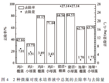 由圖4 可知,小球藻和柵藻對(duì)雞Ⅱ、豬沼和池塘培養(yǎng)液中總氮的去除率較高,在62. 79% ~ 84. 54% 之間,對(duì)雞Ⅰ中總氮的去除率較低(33. 73% 和42. 86% )。結(jié)合總氮初始值,實(shí)際總氮減少量:豬沼> 雞Ⅰ >雞Ⅱ > 池塘,與初始值大小排序相同。認(rèn)為這種結(jié)果與溶液中無機(jī)氮的含量有關(guān)。浮游植物可以直接利用水體中的可溶性無機(jī)氮,但對(duì)有機(jī)氮一般需要降解為溶解性無機(jī)氮后方可利用。實(shí)驗(yàn)開始時(shí),豬沼、雞Ⅰ、雞Ⅱ和池塘中無機(jī)氮(氨氮、硝氮及亞硝氮等)的總量分別為19. 56、10. 38、4. 33 和2. 42 mg·L - 1 ,均超過有機(jī)氮含量,且其中又以氨氮和硝氮居多,適宜的無機(jī)氮形態(tài)和濃度有利于微藻的吸收利用,因而產(chǎn)生上述結(jié)果。