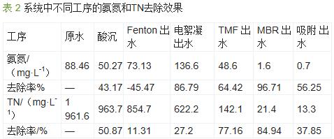 由圖2>可見(jiàn),氨氮和TN的初始質(zhì)量濃度分別為70~90mg/L和1000~2000mg/L,經(jīng)過(guò)酸沉、Fenton氧化、電絮凝、TMF過(guò)濾、MBR和吸附等工序后,去除率均達(dá)到95%以上。