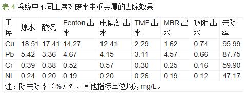 由表4可見(jiàn),廢水經(jīng)過(guò)酸沉、Fenton氧化、電絮凝工序后,重金屬略有降低。經(jīng)過(guò)TMF固液分離系統(tǒng)后,Cu的去除效果比較好,去除率達(dá)到87%。經(jīng)過(guò)MBR生化處理后,廢水中重金屬Cu、Pb、Cr、Ni的質(zhì)量濃度分別減少至0.74、0.66、0.25、0.19mg/L,再進(jìn)一步吸附后,4種重金屬的去除率分別達(dá)到95.99%、87.75%、59.90%、47.14%,其出水濃度均達(dá)到(GB21900—2008)表3標(biāo)準(zhǔn)的要求。具體參見(jiàn)http://www.dowater.com更多相關(guān)技術(shù)文檔。