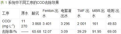 系統(tǒng)連續(xù)運(yùn)行期間,原廢水COD為8000~18000mg/L,經(jīng)過(guò)酸沉、Fenton氧化、電絮凝、TMF過(guò)濾和MBR等工序后,COD去除率達(dá)到85%~90%,進(jìn)一步吸附后COD的質(zhì)量濃度降低至50mg/L以下。