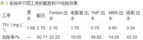 由表3可見(jiàn),工藝中對(duì)TP去除起主要作用的工序是TMF過(guò)濾,其去除率約為58%。經(jīng)過(guò)MBR和吸附處理后,廢水中TP質(zhì)量濃度小于0.5mg/L,達(dá)到(GB21900—2008)表3標(biāo)準(zhǔn)的要求。
