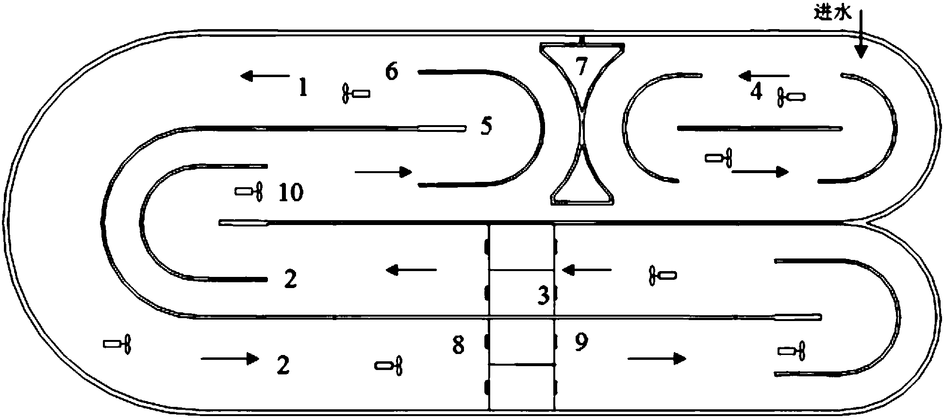 5)所述厭氧區(qū)、缺氧區(qū)和好氧區(qū)內(nèi)設(shè)有推流型潛水?dāng)嚢铏C(jī)(10);