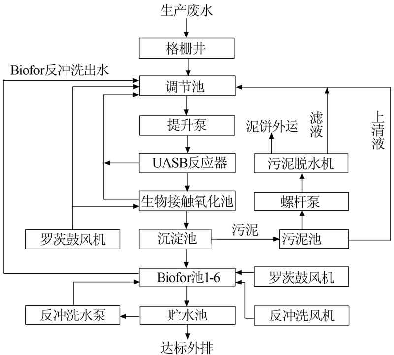 根據(jù)進水水質(zhì)和水量情況,結(jié)合調(diào)研情況和實驗室小試及中試結(jié)果進行處理工藝的優(yōu)化組合,確定了“UASB—生物接觸氧化池—Biofor工藝的序批式運行處理工藝,廢水處理站設(shè)計處理水量為600 m3/d,工藝流程如圖 1所示。