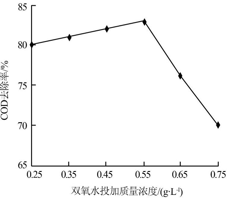 在pH=3.0,鐵炭總質(zhì)量濃度20 g/L,反應(yīng)時(shí)間40 min,MnO2投加質(zhì)量濃度為2.50 g/L,鐵炭比3∶1條件下,分別加入0.25、0.35、0.45、0.55、0.65、0.75 g/L H2O2進(jìn)行實(shí)驗(yàn),考察H2O2對(duì)微電解處理廢水體系的催化作用,結(jié)果如圖3所示。