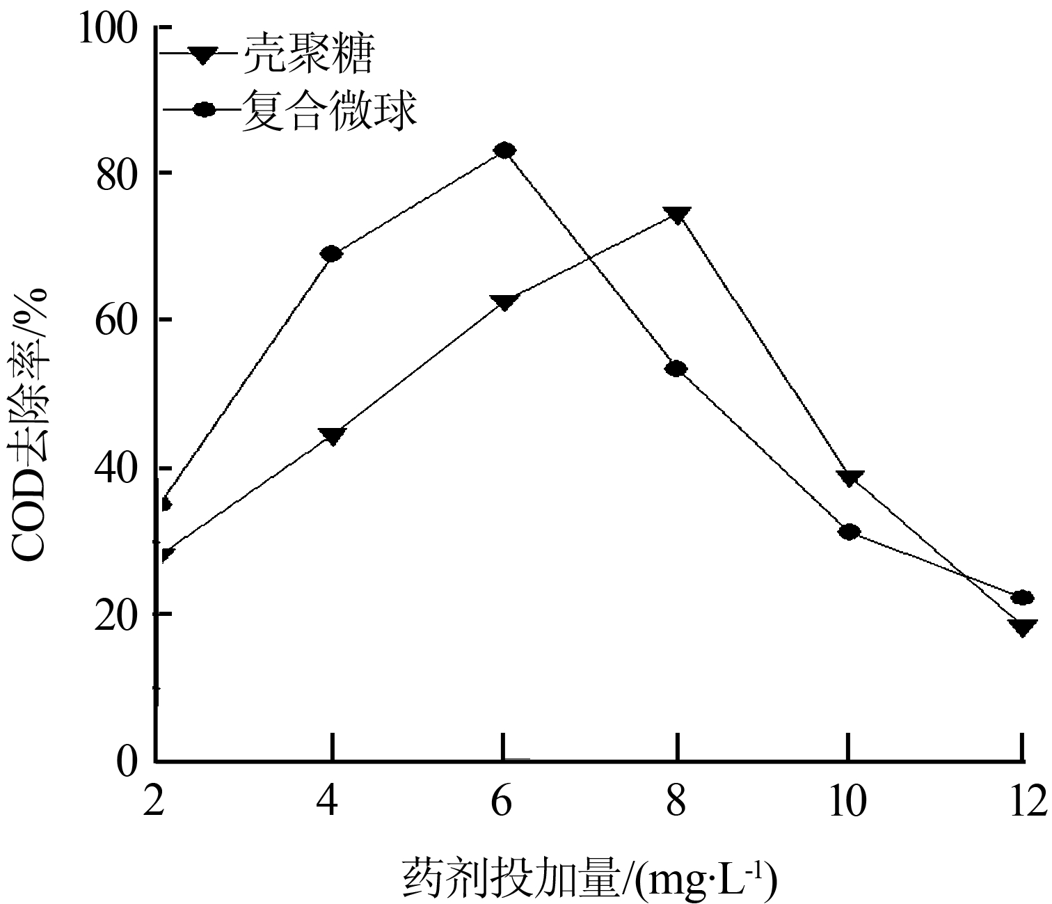 取50 mL造紙廢水于200 mL燒杯中,投加一定量的復(fù)合微球,攪拌反應(yīng)3 min。沉降,取上清液,采用標(biāo)準(zhǔn)K2Cr2O7法測定化學(xué)需氧量。同時,以殼聚糖作為絮凝劑進行平行實驗。