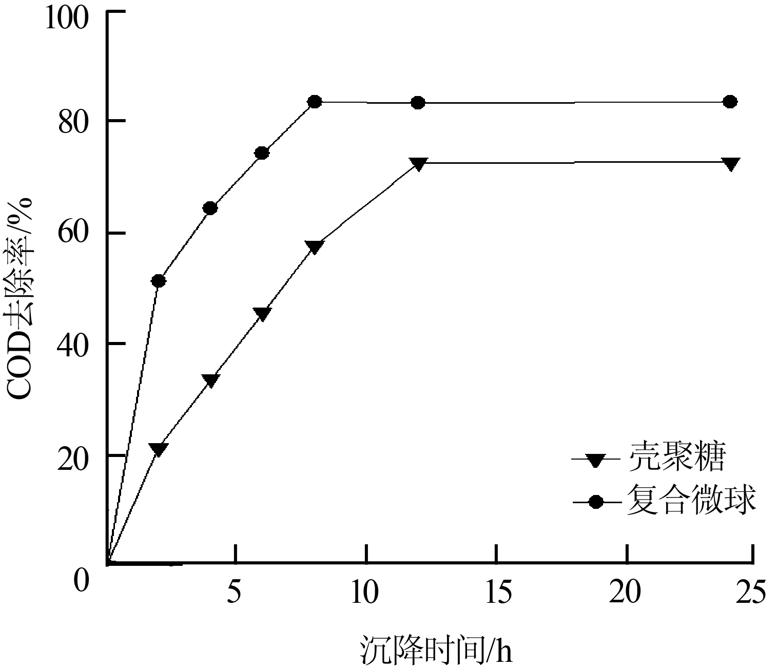 在攪拌速度為120 r/min,復(fù)合微球投加量為6 mg/L(對比實驗殼聚糖投加量為8 mg/L),沉降時間為24 h的條件下,考察了pH對處理效果的影響,結(jié)果如圖 1所示。由圖 1可知,對于單一殼聚糖而言,只在比較適的pH下才能起到比較好的處理效果。而對于復(fù)合微球,pH對處理效果的影響較小,在pH 為4~9的范圍內(nèi)COD去除率均在75%左右。復(fù)合微球在其分子結(jié)構(gòu)上具有殼聚糖本身所擁有的羥基、氨基等活性基團,同時具有交聯(lián)劑帶來的羧甲基活性基團,所以在酸性或堿性條件下均可以在一定程度上接受和供給H+,進而起到穩(wěn)定的絮凝的作用。