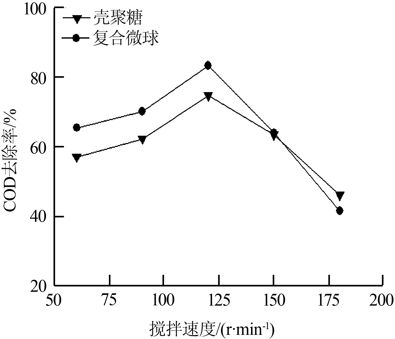 在pH為8,復(fù)合微球投加量為6 mg/L(對比實驗殼聚糖投加量為8 mg/L),沉降時間為24 h的條件下,考察了攪拌速度對處理效果的影響,結(jié)果如圖 3所示。
