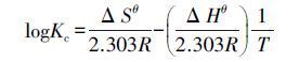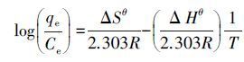 式(7)中,Kc為溫度T下的平衡常數(shù),可以通過Kc=qe/Ce計算,qe為平衡吸附容量,Ce為溶液中吸附質的平衡濃度,ΔGθ、ΔHθ和ΔSθ分別為標準狀態(tài)下吸附反應的吉布斯自由能變、焓變和熵變.公式(7)也可以表示為: