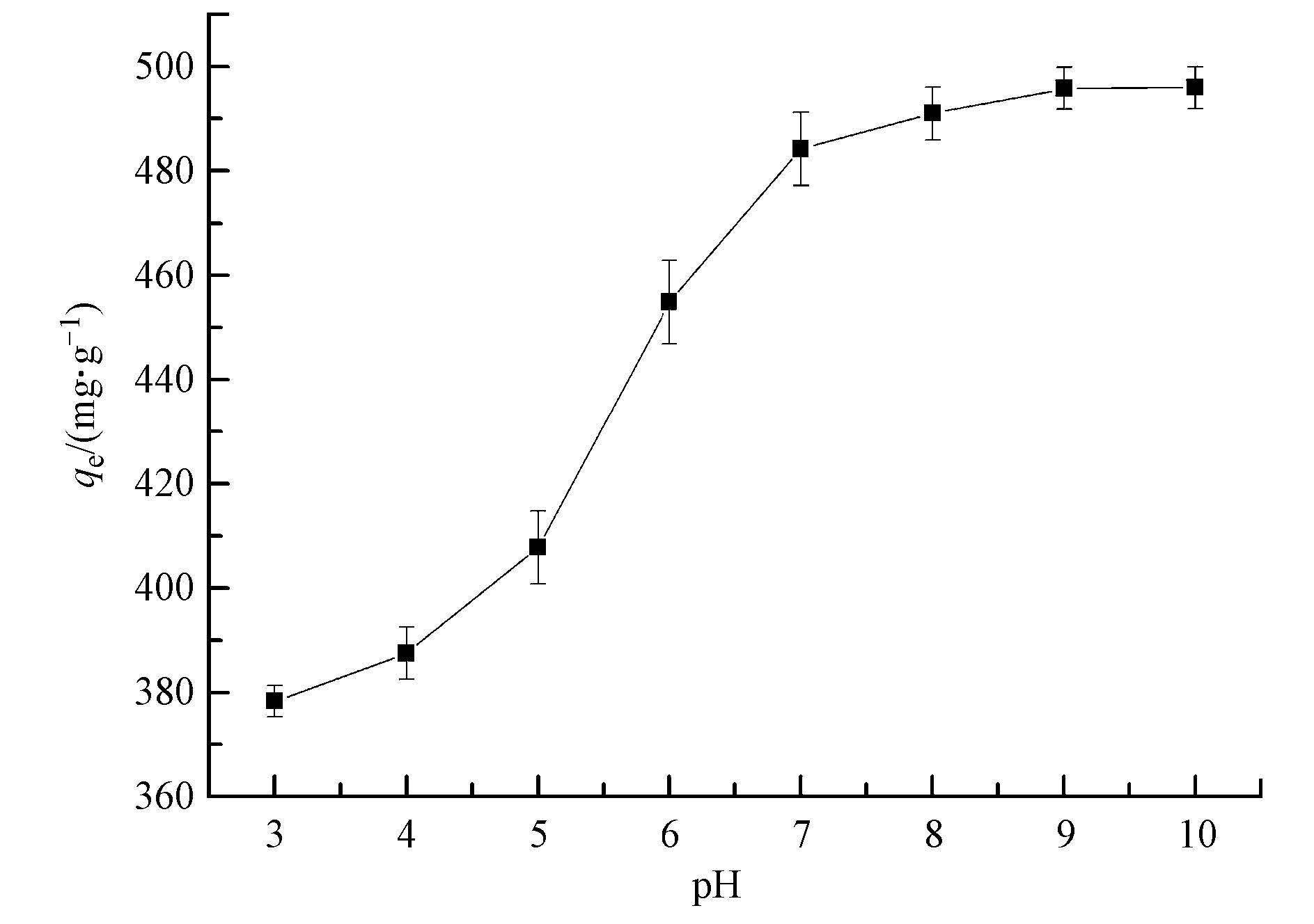 溶液的pH對吸附劑的結合位點以及電離影響很大,因此研究不同pH下吸附劑對甲基綠的吸附.如圖 6所示,在低pH下甲基綠的吸附量很小,隨著pH增加,吸附量也增加,到pH為8的時候吸附量基本趨于不變.在低pH下,吸附劑表面質子化,帶上正電荷,而甲基綠在溶液中以陽離子的形式存在,二者之間的靜電斥力導致不能有效的吸附.pH增大后,F(xiàn)e3O4@C表面脫質子帶負電,在靜電作用下,二者有利于相互接觸并進一步吸附.所以Fe3O4@C對甲基綠的后續(xù)吸附實驗設定在中性和弱堿性條件下進行.