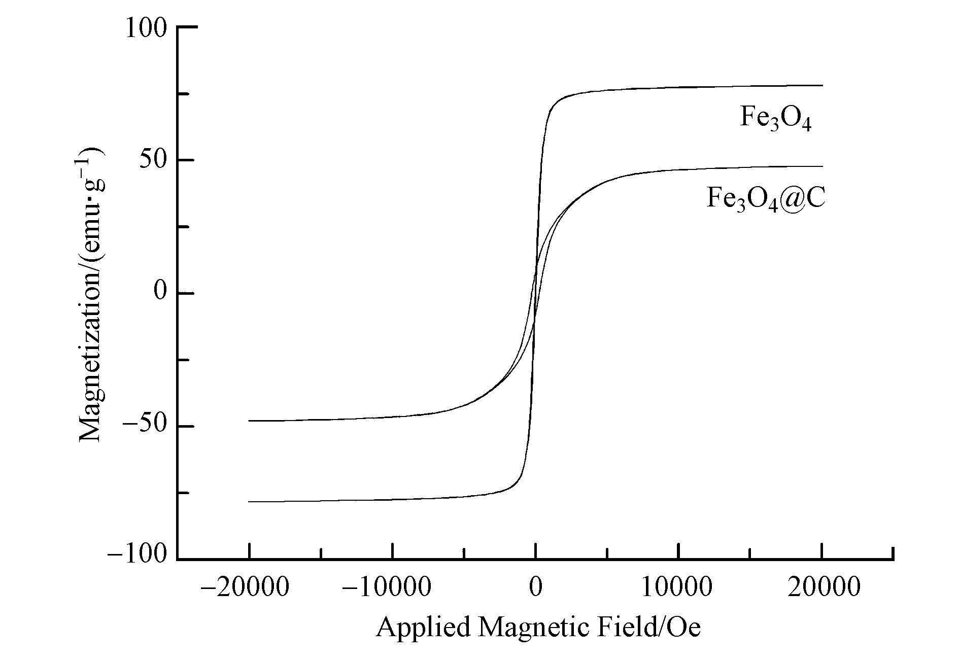 圖 2給出了Fe3O4、Fe3O4@C的磁滯回線.Fe3O4沒有磁滯現(xiàn)象,矯頑磁性和剩磁基本為零,表現(xiàn)出順磁性的特性,而Fe3O4@C出現(xiàn)了明顯的磁滯現(xiàn)象,剩磁為7.86,矯頑力為251,顯示出少量鐵磁性,這可能是由于在聚合多巴胺炭化的過程中部分Fe3O4在高溫條件下相變?yōu)镕e2O3.Fe3O4和Fe3O4@C的比較大飽和磁強度分別為78.7 emu·g-1和47.2 emu·g-1.Fe3O4@C磁性降低是因為引入了無磁性的殼層.材料吸附了污染物后,利用磁鐵很容易從溶液中分離出來.