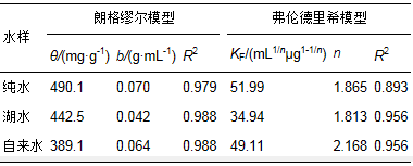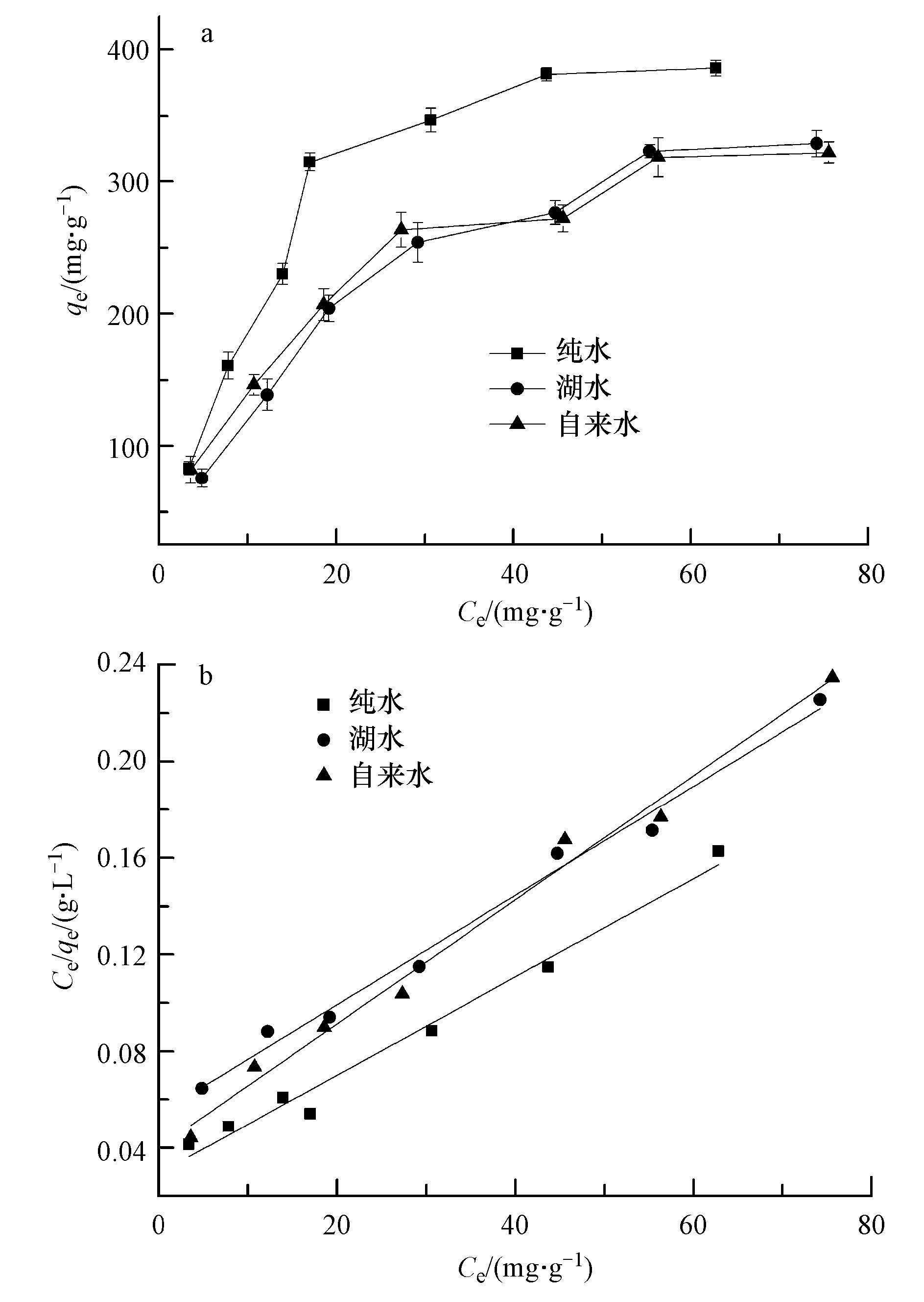 等溫吸附研究在30 ℃下進行,甲基綠初始濃度設置為20、40、60、80、100、120、140 mg·L-1,為考察吸附劑對不同水樣中甲基綠的吸附效果,選擇純水、湖水和自來水作為介質,吸附數(shù)據(jù)如圖 7a.隨著各水樣中甲基綠濃度的上升,吸附容量在開始時急劇上升,隨后就趨于平緩,說明吸附達到了飽和.采用朗格繆爾和弗倫德里希兩種模型對吸附數(shù)據(jù)進行擬合,兩種模型線性方程如(1)、(2)所示.