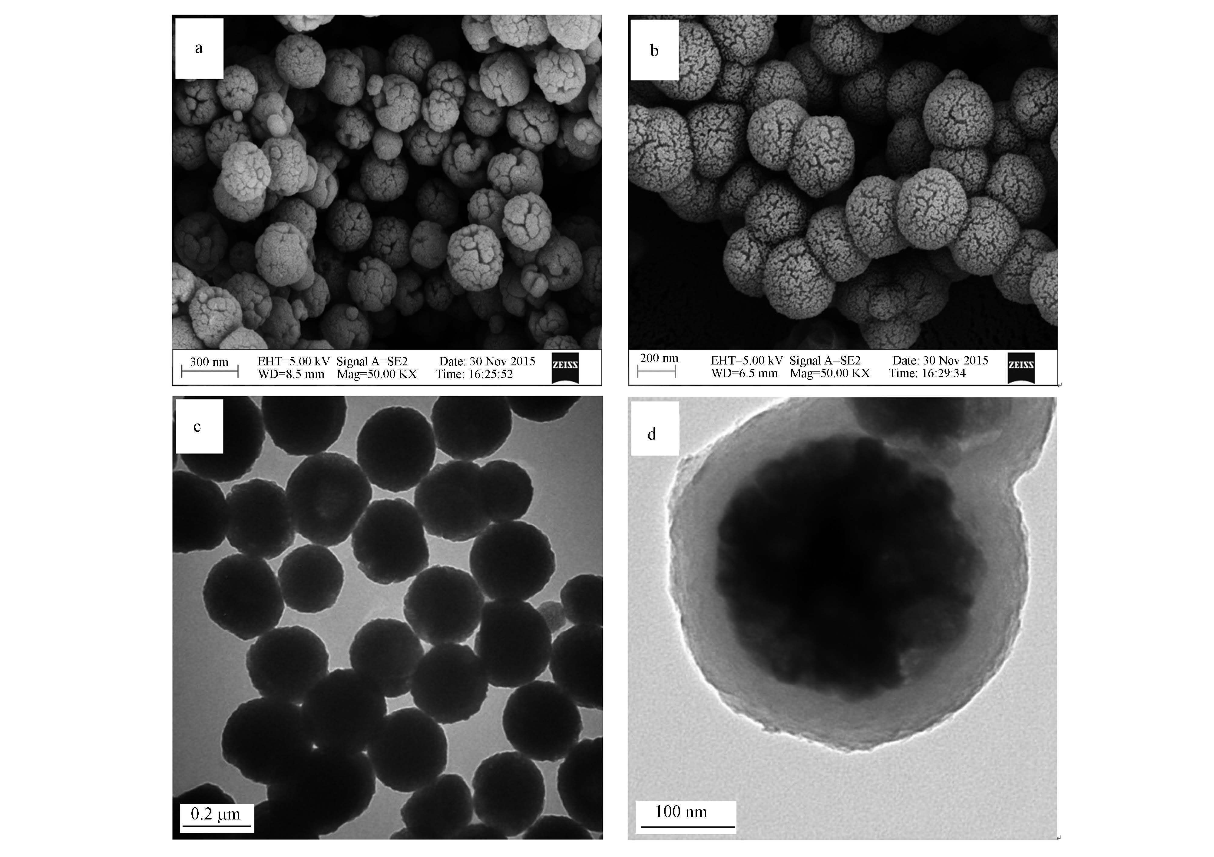 圖 1 Fe3O4和Fe3O4@C的掃描電鏡(a,b)和透射電鏡(c,d)圖