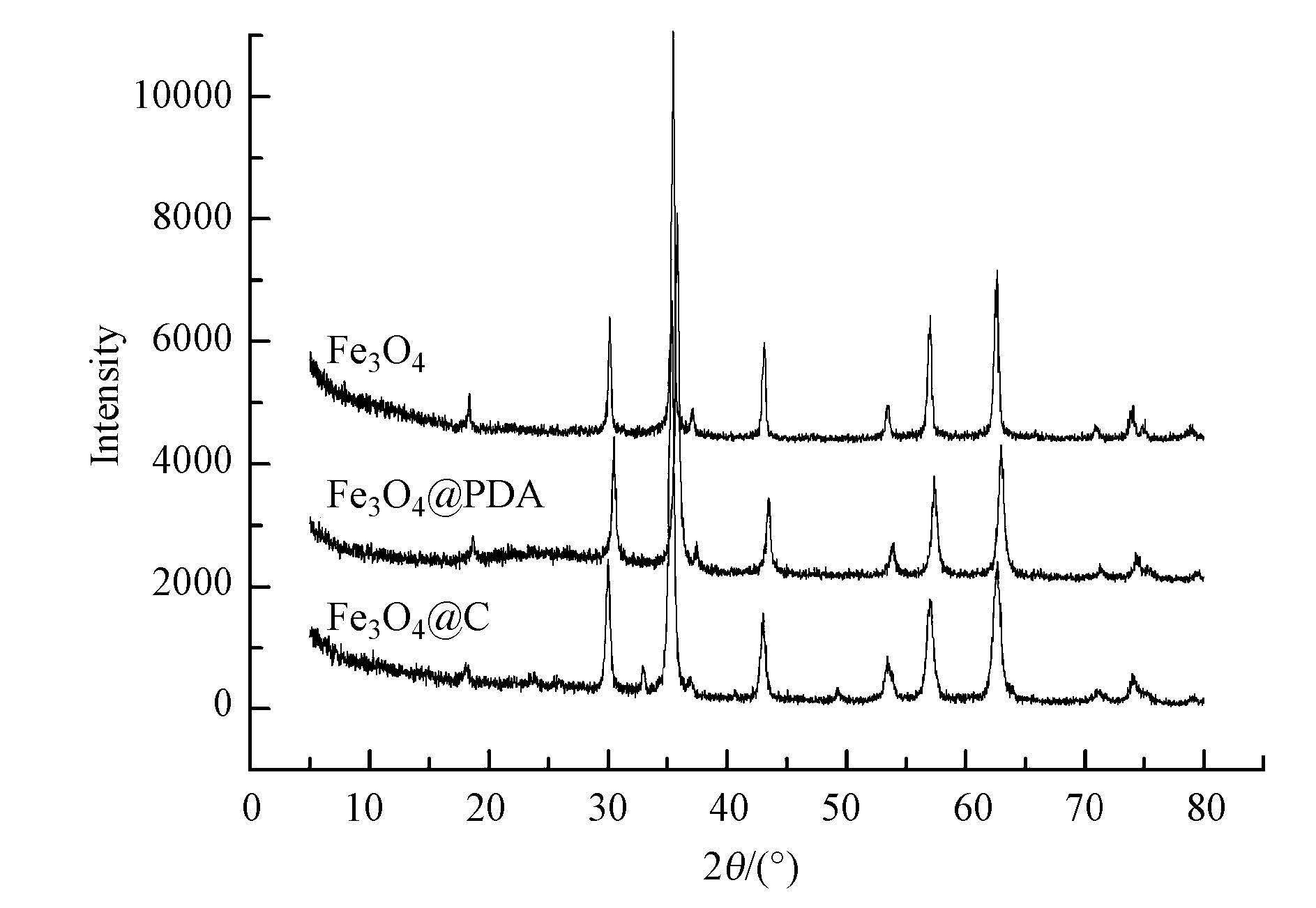 圖 3給出了Fe3O4、聚多巴胺包覆的Fe3O4@PDA、Fe3O4@C的X射線衍射圖.Fe3O4和Fe3O4@PDA衍射峰的位置完全一樣,在2θ為30.12°、35.38°、43.05°、53.39°、56.91°、62.54°處出現(xiàn)了較強的衍射峰,其分別對應立方相Fe3O4的(220)、(311)、(400)、(422)、(511)、(440)晶面(張燚等,2011;危晶等,2012;黃保軍等,2012),經(jīng)過在高溫下炭化得到的Fe3O4@C除在以上位置有衍射峰外,在2θ為33.17°和49.33°處有較小的衍射峰,對應著斜六方Fe2O3的(104)和(024)晶面,這說明在炭化的過程中部分Fe3O4相變?yōu)镕e2O3,與磁性測量的結果一致.