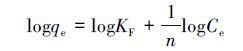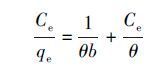 式中,qe和Ce 分別為平衡吸附容量(mg·g-1)和平衡濃度(mg·L-1);θ為比較大吸附容量,b為平衡吸附常數(shù).比較大吸附容量θ可以通過Ce /qe對Ce斜率的線形 圖計算.KF(mL1/n μg1-1/n)和n是Freundlich常數(shù).n和KF的值是通過logqe對logCe的線性擬合的截距求出.圖 7b是吸附數(shù)據(jù)的Langmuir線性擬合.