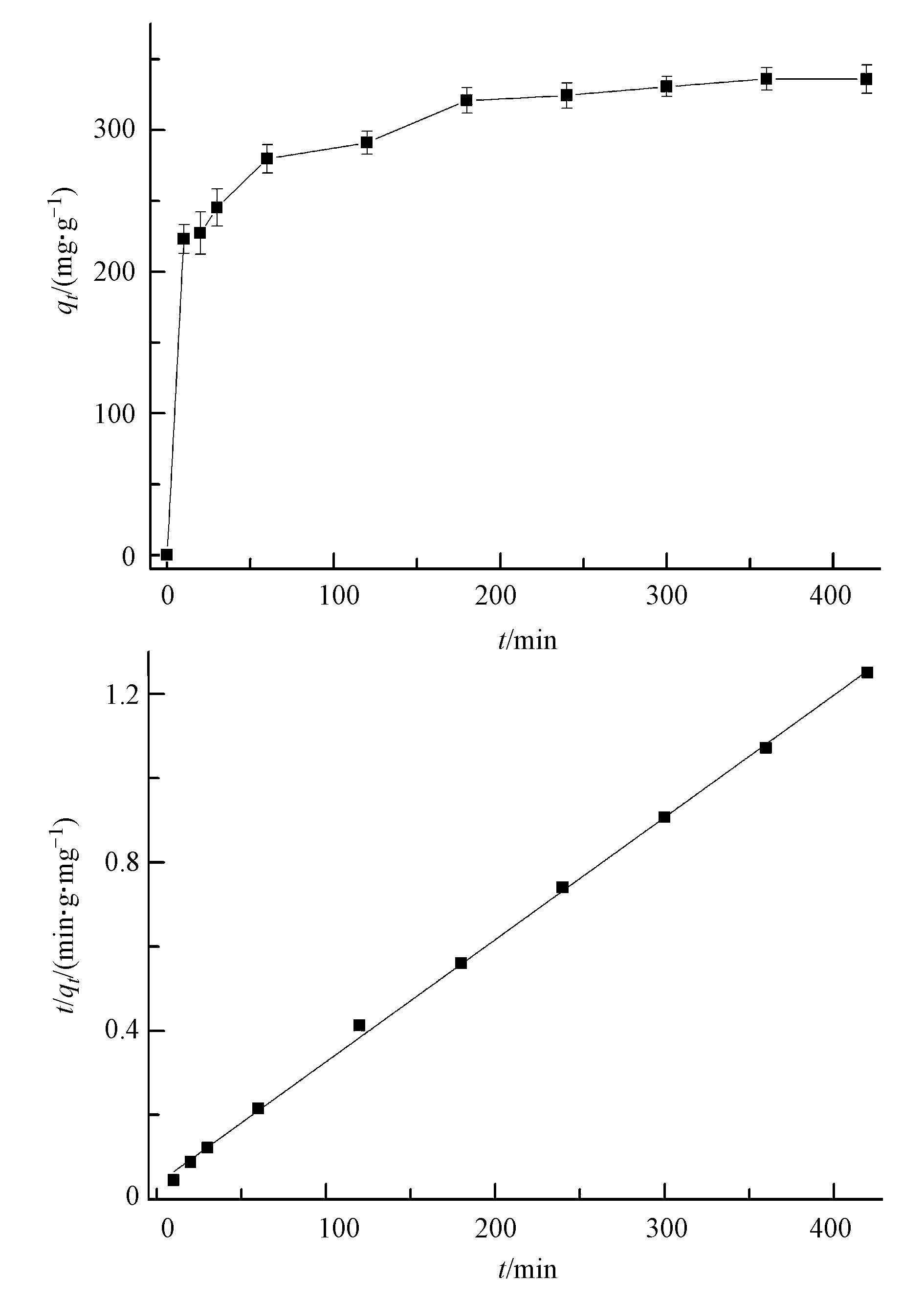 甲基綠的吸附動力學見圖 8a,甲基綠的吸附量隨時間的增加快速上升,到一定時間后趨于平緩,吸附時間達到200 min后,吸附容量基本不隨時間延長而增加,說明已經(jīng)達到吸附平衡.用擬二級動力學模型描述Fe3O4@C對甲基綠的吸附,線性方程如式(3)、(4)所示.