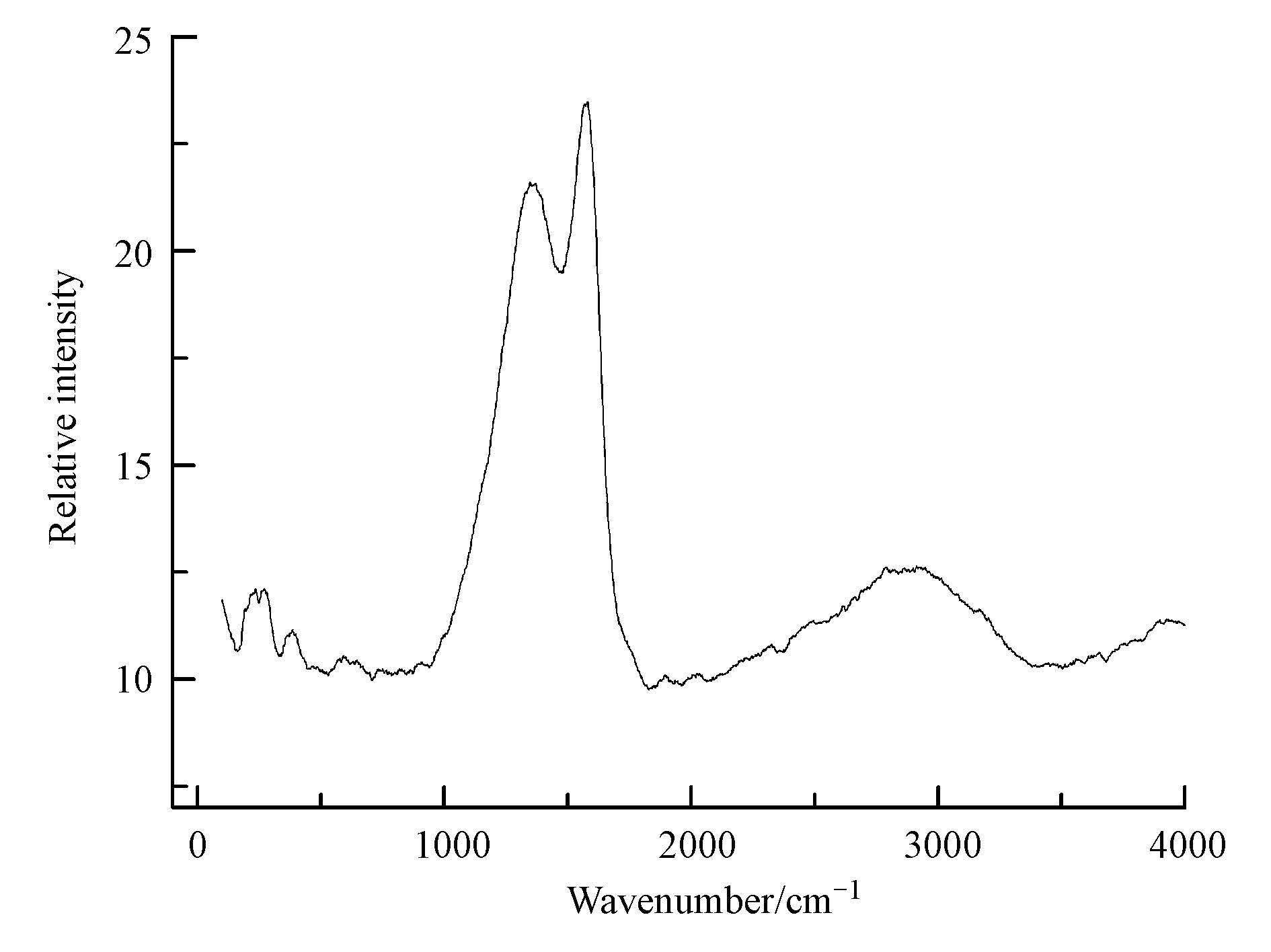 圖 5為Fe3O4@C的拉曼光譜圖,圖譜中出現(xiàn)在波數(shù)為1350 cm-1附近的峰稱為D峰,D峰反映炭原子晶體的缺陷程度,是石墨晶格缺陷、邊緣無序排列和低對稱碳結構所引起的,代表炭材料中亂層結構,是無序碳對應的特征峰,其強度表征材料中sp2碳組成的六角網(wǎng)平面以及非石墨化邊界數(shù)量,即無序化度,位于波數(shù)為1580 cm-1附近的峰為G峰,是由石墨晶體的面內振動產(chǎn)生,和材料的石墨化程度有關,是用來表征石墨的峰(王定美等,2013;周慧龍等,2014;李偉等,2014).D峰和G峰的出現(xiàn)表明炭材料成功的包覆到Fe3O4上,G峰強度強于D峰說明在高溫炭化的過程中部分炭材料被石墨化.