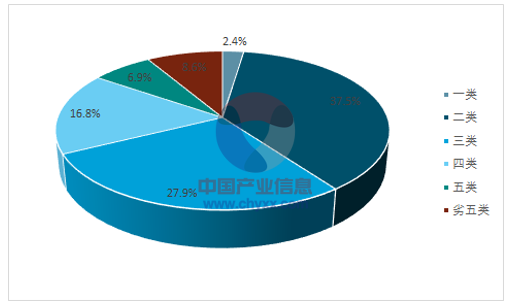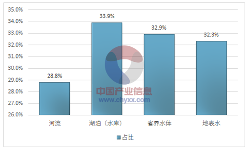 資料來(lái)源:2016年中國(guó)環(huán)境公報(bào)2016年,全國(guó)地表水1940個(gè)評(píng)價(jià)、考核、排名斷面中,Ⅰ類、Ⅱ類、Ⅲ類、Ⅳ類、Ⅴ類和劣Ⅴ類水質(zhì)斷面分別占2.4%、37.5%、27.9%、16.8%、6.9%和8.6%。