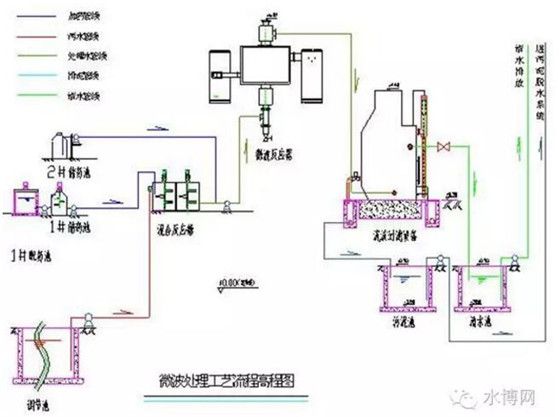 消化池微波化學(xué)污水處理工藝不同于傳統(tǒng)的污水處理工藝,其優(yōu)點是工藝流程大大簡化,且減少大量的管網(wǎng)工程,對進(jìn)水的pH,濃度、溫度等無特殊要求,工藝流程圖見圖。工藝流程圖