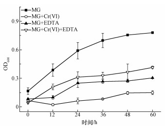 如圖 1所示,在空白實(shí)驗(yàn)中(沒有重金屬Cr(Ⅵ)或者EDTA存在的條件下),即僅加入0.1 mmol·L-1的孔雀綠(MG)時(shí),B. Cepacia C09G在前36 h快速生長,OD600接近了0.7,而后因?yàn)镸G基本降解完,缺乏營養(yǎng)物質(zhì)生物量增長緩慢,60 h后比較終OD600值為0.78;僅加入0.5 mmol·L-1 Cr(Ⅵ),對微生物的生長有很強(qiáng)的抑制作用,生物量很低,僅為0.15;僅加入0.5 mmol·L-1 EDTA,毒性雖然比Cr(Ⅵ)更小,但仍有一定的抑制作用,60 h時(shí)OD600為0.31.據(jù)報(bào)道,EDTA和EDTA-Metal對土壤微生物都是有毒的(Grcman et al., 2001).當(dāng)同時(shí)添了EDTA和Cr(Ⅵ)時(shí),OD600為0.42,大于單獨(dú)加入Cr(Ⅵ)或者EDTA時(shí),說明其生物毒性比單獨(dú)加入Cr(Ⅵ)或EDTA有所降低,因此,可以推測EDTA可以有效降低Cr(Ⅵ)的毒性.