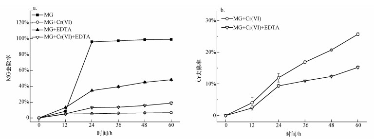 圖 2a為不同條件對孔雀綠的降解影響,在僅加入0.1 mmol·L-1 MG的情況下,MG在24 h的去除率達(dá)到96.2%;只添加0.5 mmol·L-1 Cr(Ⅵ),60 h時(shí)MG的去除率均為6.7%,單獨(dú)添加0.5 mmol·L-1 EDTA時(shí),60 h時(shí)MG的去除率為48.4%,說明Cr(Ⅵ)和EDTA均會抑制B. Cepacia C09G對孔雀綠的降解.同時(shí)添加EDTA和Cr(Ⅵ)時(shí),60 h MG的去除率上升到18.8%,相對于單獨(dú)加Cr(Ⅵ)的降解率有所提高,可以看出,EDTA確實(shí)可以有效地降低Cr(Ⅵ)的抑制作用,從而提高對孔雀綠的降解效率.也有研究證實(shí),加入EDTA可以降低5 μmol·L-1 Cd、Cu和Zn對細(xì)菌Escherichia coli的毒性(Campbell et al., 2000).