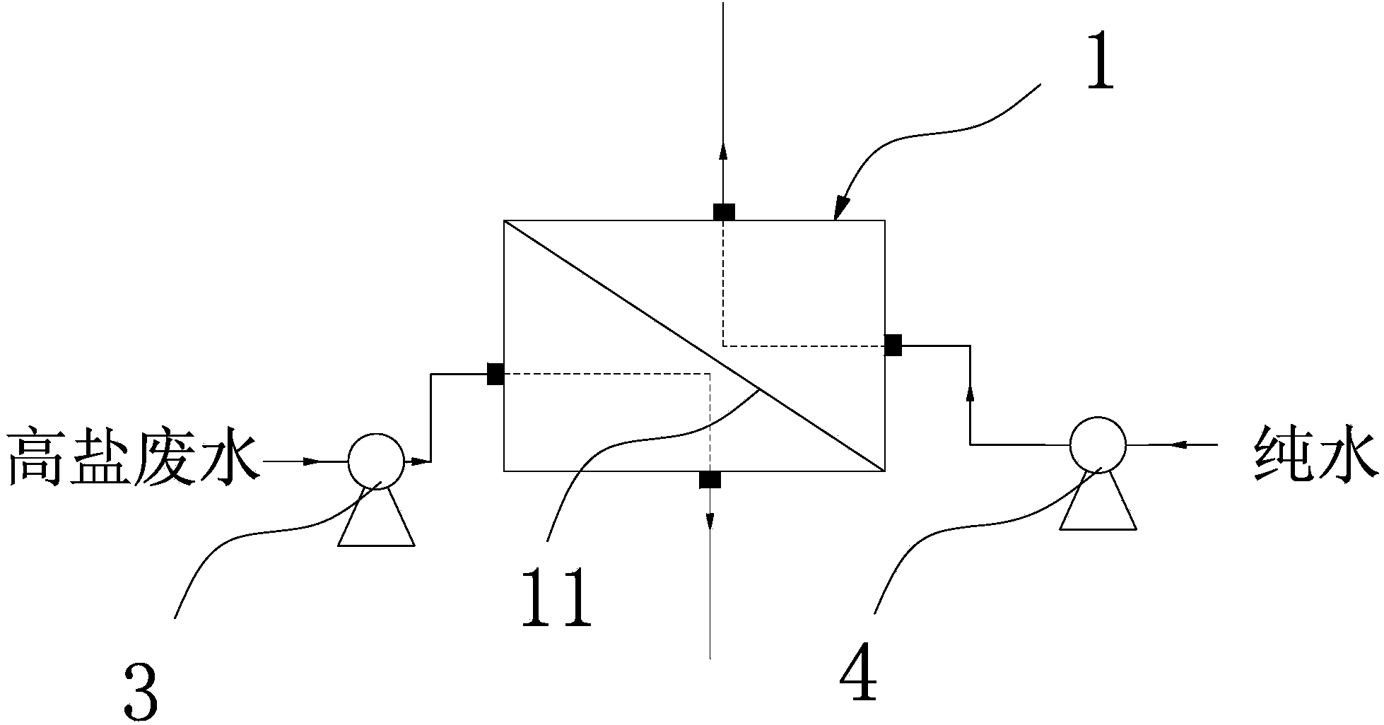 A、通過水泵一(3)將高鹽廢水輸送到納濾設(shè)備;通過水泵二(4)將純水輸送至納濾設(shè)備,再使高鹽廢水和純水分別從納濾設(shè)備中的納濾膜(21)兩側(cè)流經(jīng)納濾膜(21)進(jìn)行納濾;所述納濾設(shè)備中的納濾膜(21)一側(cè)流經(jīng)高鹽廢水的為高鹽廢水側(cè);所述納濾設(shè)備中的納濾膜(21)另一側(cè)流經(jīng)純水的為純水側(cè);所述高鹽廢水從納濾設(shè)備中的高鹽廢水側(cè)流入和排出;所述純水從納濾設(shè)備中純水側(cè)流入和排出;