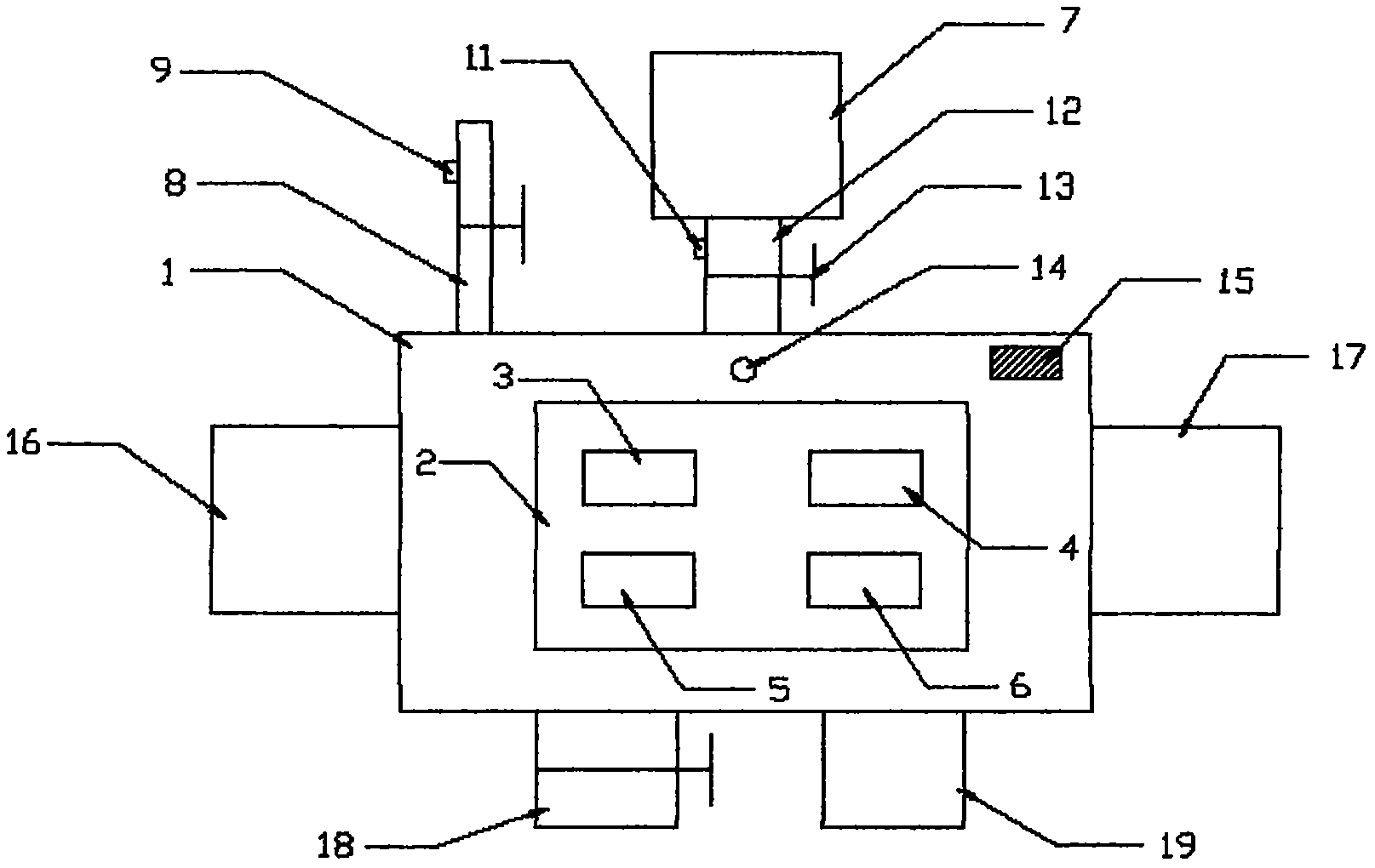 本實用新型所達到的有益效果是:本實用新型的結(jié)構(gòu)簡單,造價低廉,且實用性強,通過全程的智能化操作控制,智能化程度高,可以進行精確的藥劑添加,消除了原有的人工投加藥劑勞動強度大、效率低、投加不精確的問題,方便了水處理工作的有效進行,提高了工作效率;通過設(shè)有酸堿中和管,酸堿中和管與酸堿儲存箱連接,當水的PH酸堿度過大或過低時,便于通過酸堿中和管進行酸堿的的中和,使水的PH保持均衡,有效的提高了水處理的質(zhì)量。
