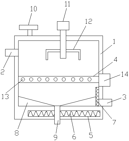 本發(fā)明的有益效果為:設(shè)置的箱體保持結(jié)構(gòu)緊湊;設(shè)置的攪拌槳呈L型,保持污水混合均勻,保持污水處理效果好;設(shè)置的曝氣管能夠通入空氣,保持污水進(jìn)行生物反應(yīng);設(shè)置的調(diào)壓閥能夠調(diào)節(jié)箱體內(nèi)的氣壓,保持使用安全;設(shè)置的斜板方便污泥的排除,保持使用方便。