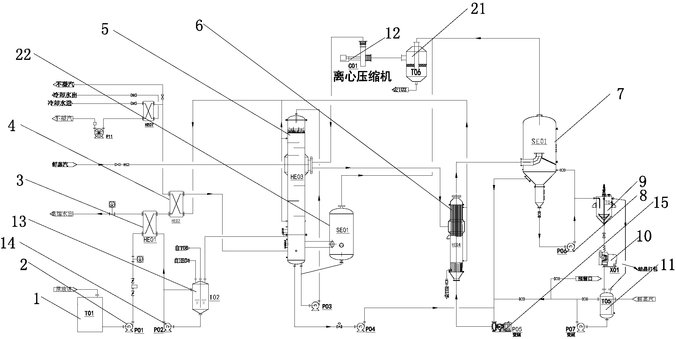 步驟8:進(jìn)一步濃縮的物料被打入結(jié)晶分離器內(nèi)進(jìn)行閃蒸濃縮,濃縮液和二次蒸汽在結(jié)晶分離器中進(jìn)行汽液分離;氣液分離后的二次蒸汽從分離器中出來通過離心壓縮機(jī)升溫升壓后打入降膜蒸發(fā)器和強(qiáng)制循環(huán)換熱器;