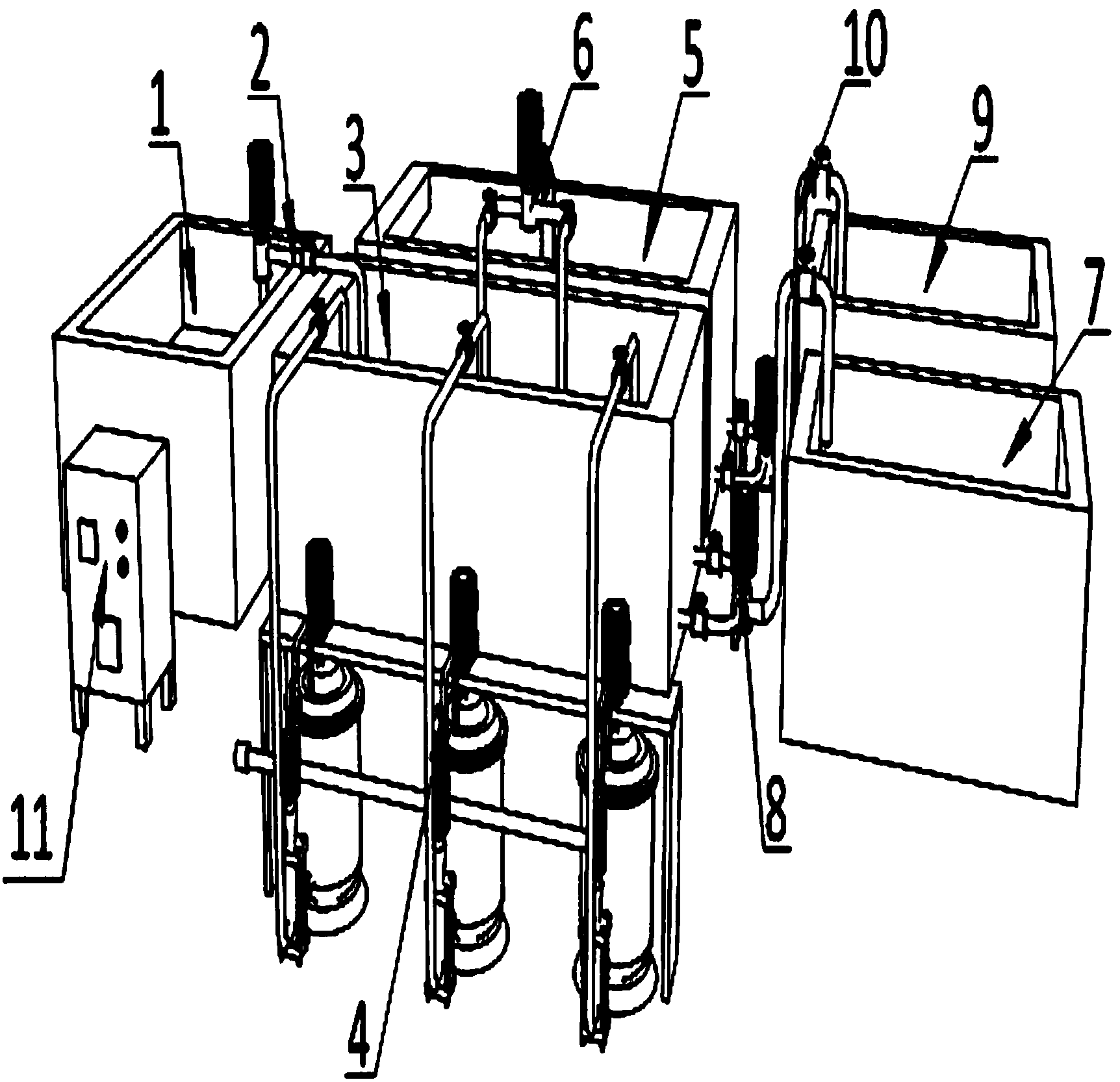 為了解決上述技術(shù)問題,本發(fā)明提供一種生物反應(yīng)處理酸洗磷化污水設(shè)備,包括:廢液混合池1,混合液泵進(jìn)系統(tǒng)2,反應(yīng)堆水池3,生物劑添加系統(tǒng)4,加壓過濾池5,反應(yīng)廢液泵進(jìn)系統(tǒng)6,污泥脫水池7,污泥泵進(jìn)系統(tǒng)8,水力循環(huán)澄清池9,清水泵進(jìn)系統(tǒng)10,控制系統(tǒng)11;所述廢液混合池1由混凝土堆砌成凹槽狀;所述混合液泵進(jìn)系統(tǒng)2設(shè)置有混合液泵送電機(jī)和混合液泵送電磁閥,混合液泵進(jìn)系統(tǒng)2進(jìn)液管路與廢液混合池1貫通連接,混合液泵進(jìn)系統(tǒng)2出液管路與反應(yīng)堆水池3貫通連接;所述生物劑添加系統(tǒng)4位于反應(yīng)堆水池3一側(cè),生物劑添加系統(tǒng)4輸出端與反應(yīng)堆水池3貫通連接;所述反應(yīng)堆水池3另一側(cè)設(shè)置有加壓過濾池5;反應(yīng)堆水池3與加壓過濾池5之間正上方固定安裝有反應(yīng)廢液泵進(jìn)系統(tǒng)6,反應(yīng)廢液泵進(jìn)系統(tǒng)6設(shè)置有反應(yīng)廢液泵進(jìn)電機(jī)、反應(yīng)廢液泵進(jìn)電磁閥和反應(yīng)廢液泵出電磁閥,所述反應(yīng)廢液泵進(jìn)電磁閥通過反應(yīng)廢液輸入管路與反應(yīng)堆水池3貫通連接,反應(yīng)廢液泵出電磁閥通過反應(yīng)廢液輸出管路與加壓過濾池5貫通連接;所述污泥脫水池7通過污泥泵進(jìn)系統(tǒng)8與反應(yīng)堆水池3貫通連接,所述污泥泵進(jìn)系統(tǒng)8設(shè)置有污泥泵進(jìn)電機(jī)、污泥泵進(jìn)電磁閥和污泥泵出電磁閥,其中所述污泥泵進(jìn)電磁閥通過污泥泵進(jìn)管路與反應(yīng)堆水池3貫通連接,所述污泥泵出電磁閥通過污泥泵出管路與污泥脫水池7貫通連接;所述水力循環(huán)澄清池9位于加壓過濾池5一側(cè),水力循環(huán)澄清池9通過清水泵進(jìn)系統(tǒng)10與加壓過濾池5貫通連接,所述清水泵進(jìn)系統(tǒng)10設(shè)置有清水泵進(jìn)電機(jī)、清水泵進(jìn)電磁閥和清水泵出電磁閥,其中所述清水泵進(jìn)電磁閥通過清水泵進(jìn)管路與加壓過濾池5貫通連接,所述清水泵出電磁閥通過清水泵出管路與水力循環(huán)澄清池9貫通連接;所述控制系統(tǒng)11設(shè)置于中央控制室;